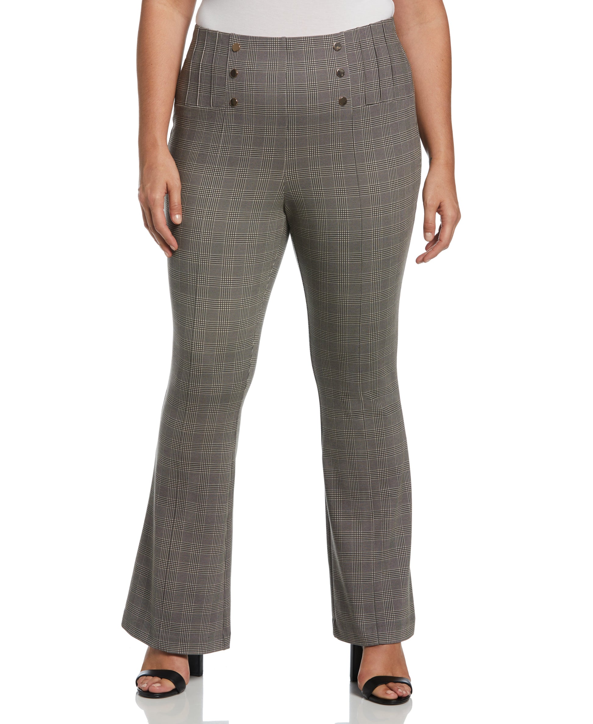Dressed up or down, these Ella ladies' trousers are sure to impress. Featuring a plaid print, soft gold rivet detailing and front and back seams, these pull-on dress pants for women are equally stylish and versatile. They're crafted from a ponte fabric that retains its shape and offered in a modern fit that's sleek and flattering. The bootcut ankle fits comfortably over your favorite footwear and has a fresh look that's sure to stand out.
